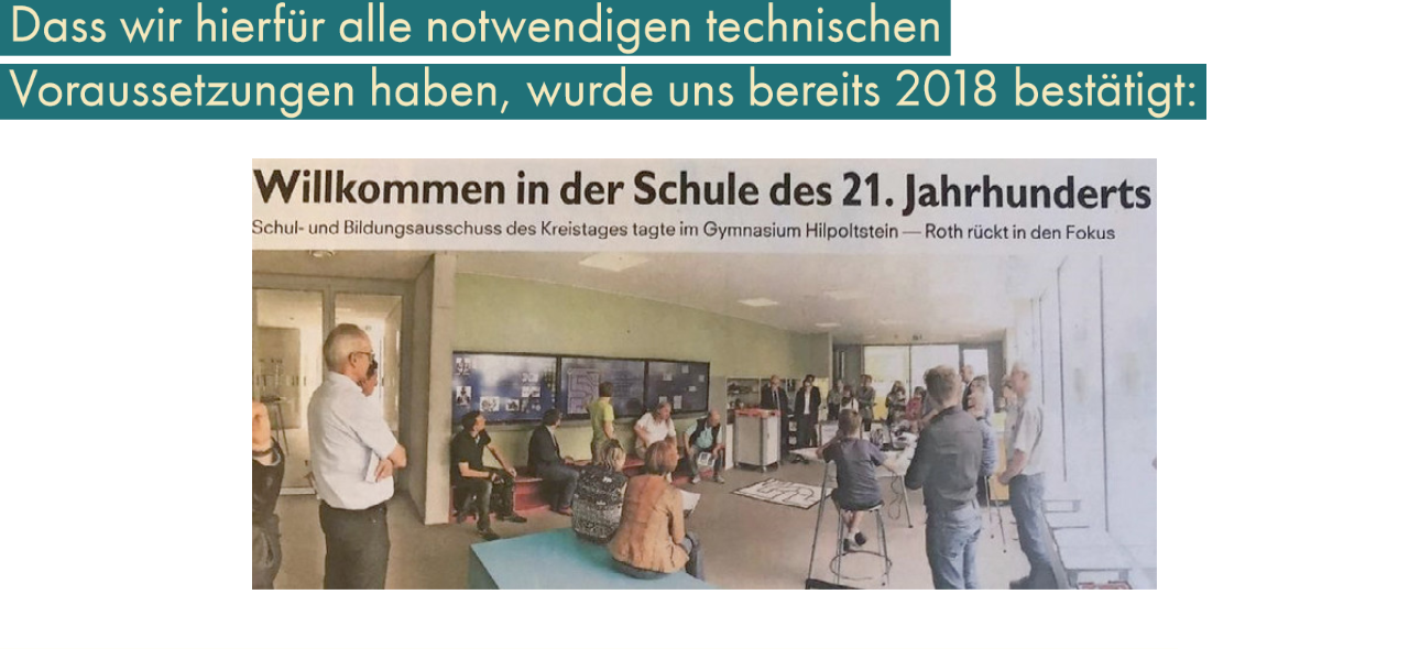 Wir leben in einer durch und durch vernetzten, sich rasant verändernden Welt. Diese Welt stellt immer neue Anforderungen an die Gesellschaft als Ganzes sowie an jeden einzelnen und damit natürlich auch an Bildung und vor allem an uns Lehrkräfte. Wir nehmen diese Herausforderung an! Unser Ziel ist es, unsere Schülerinnen und Schüler dazu zu befähigen, Neuerungen offen und mutig zu begegnen, um deren Chancen zu nutzen, sich aber auch der Risiken bewusst zu sein. So kann es ihnen gelingen, von den Veränderungen verantwortungsvoll zu profitieren und den Transformationsprozess für das 21. Jahrhundert aktiv mitzugestalten.