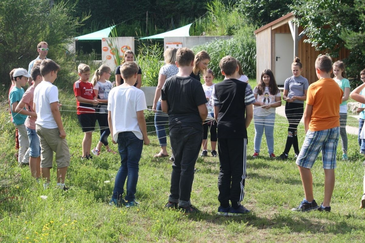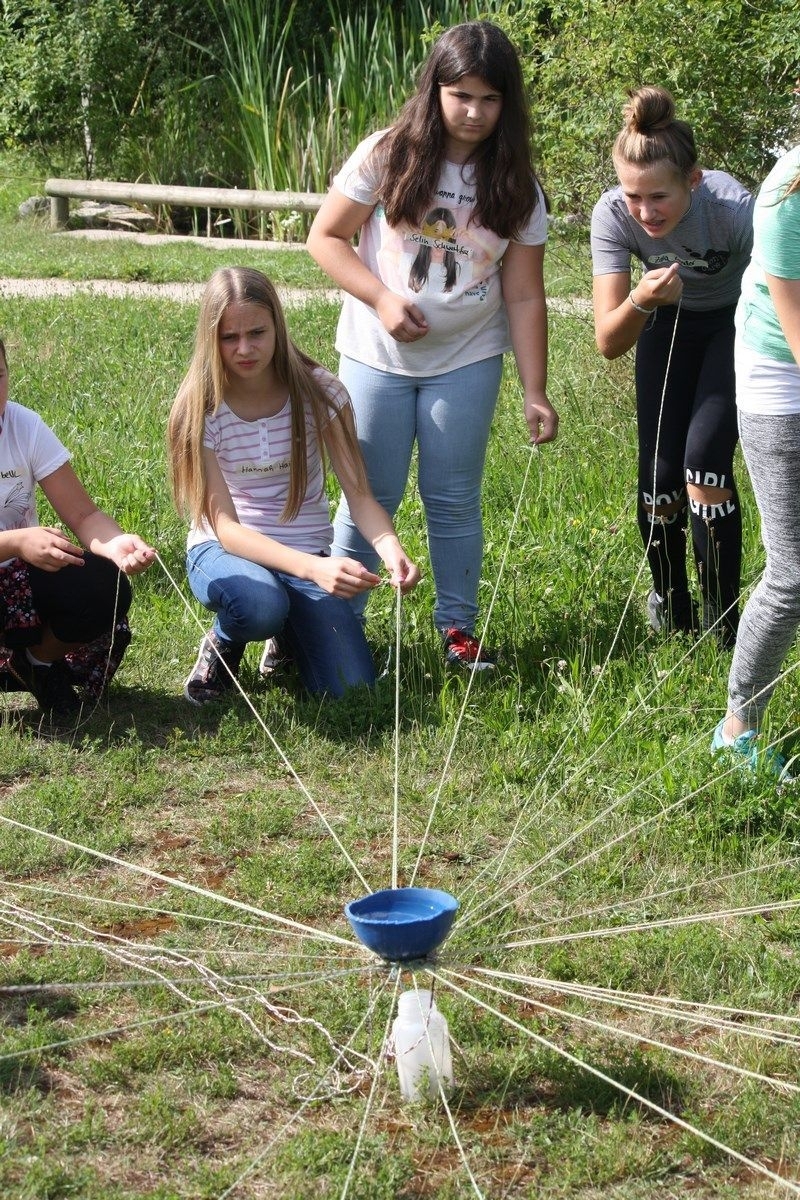 Zum Abschluss gab es noch ein spannendes Gruppenspiel, bei dem ohne zu Sprechen die ganze Klasse einen Behälter voll Wasser mit Hilfe einer „Spinne“ von einem Ort zu einem anderen transportieren musste, ohne einen Tropfen zu verschütten! Alle haben es geschafft!